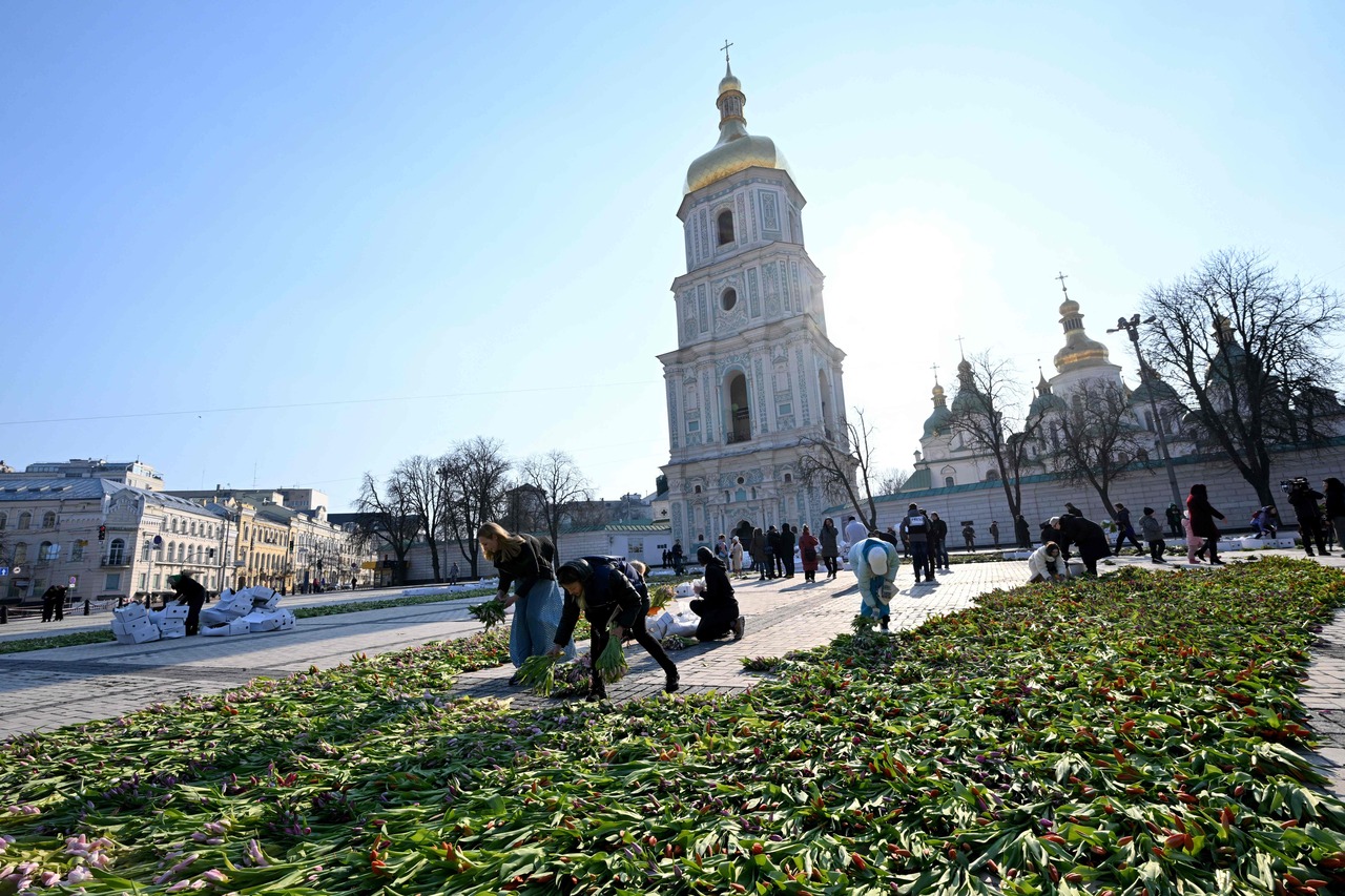 <p>Members of the public lay out one-and-a-half million tulips to form the coat of arms of Ukraine during an action dedicated to the Ukrainian women who serve in the army and volunteers, outside the Saint Sophia Cathedral in Kyiv, on March 18, 2022, following Russia's military invasion launched on Ukraine. (Photo by Sergei SUPINSKY / AFP)</p>