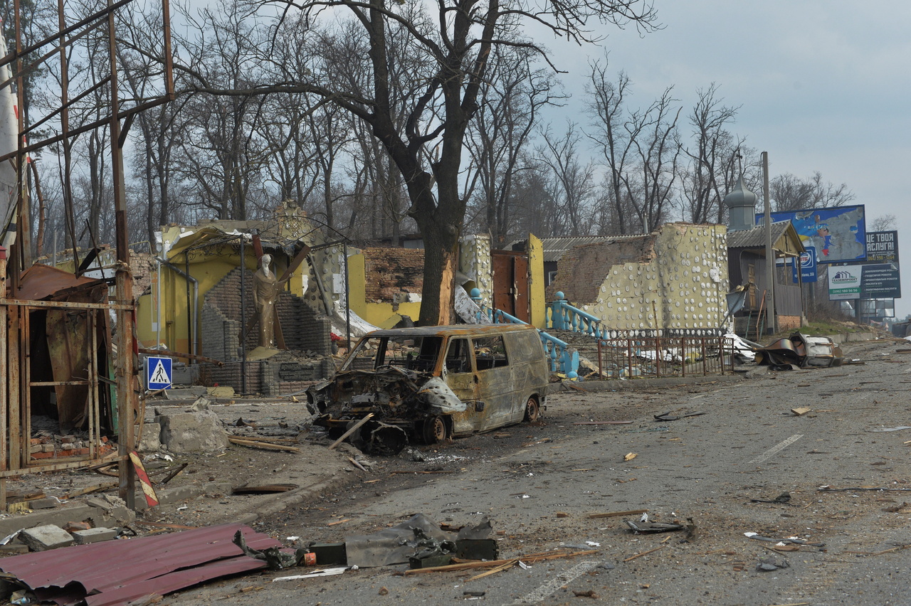 A church destroyed by shelling in the village of Hostomel, in Kyiv region, on March 31, 2022.