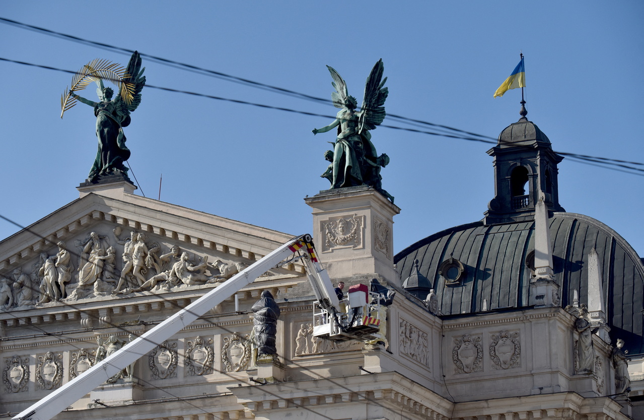 <p>Workers cover a sculpture on a facade of Lviv National Opera to protect from destruction amid Russia's invasion of Ukraine, in Lviv, Ukraine, March 21, 2022. REUTERS/Pavlo Palamarchuk