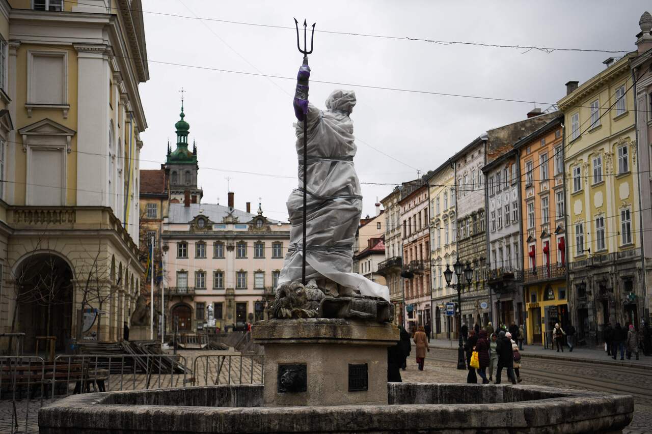 <p>Pedestrians walk past a wrapped statue next to the Archcathedral Basilica of the Assumption of the Blessed Virgin Mary also known as Latin Cathedral in Lviv western Ukraine, on March 5, 2022. (Photo by Daniel LEAL / AFP)</p>