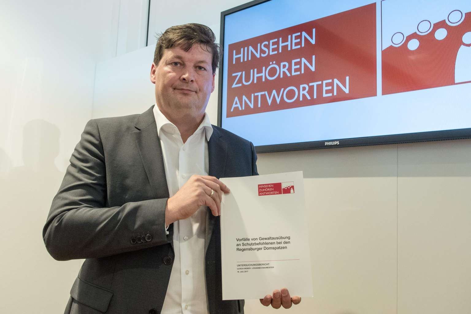Lawyer Ulrich Weber, in charge of the clarification around an abuse scandal at the Regensburger Domspatzen boy's choir, presents his report during a press conference on July 18, 2017 in Regensburg, southern Germany.