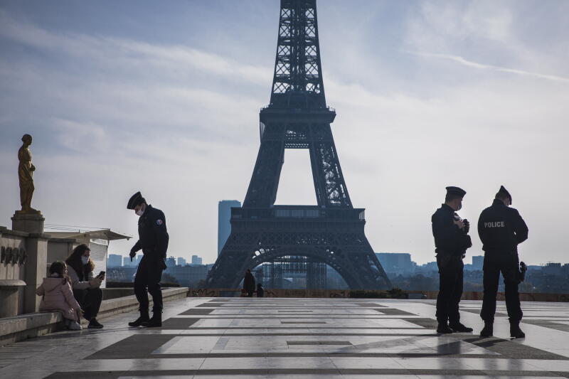 French police officers patrol in the deserted Trocadero square near the Eiffel Tower in Paris on Nov 7, 2020.