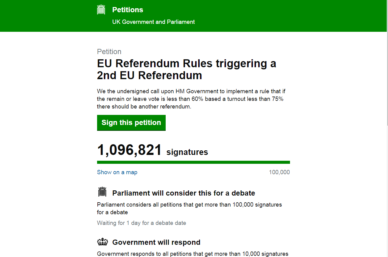 More than a million people have signed a petition calling for a second EU referendum.