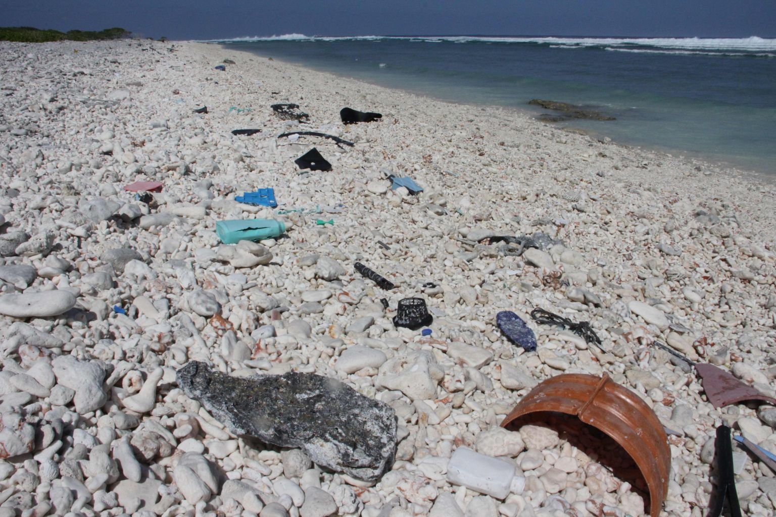 Plastic trash is seen strewn across a beach at Wake Island in the Pacific Ocean on Feb 2, 2018.