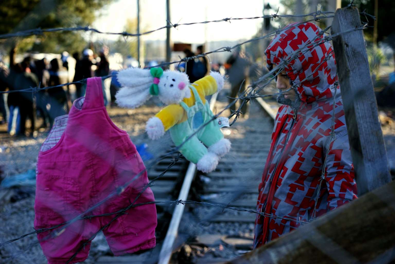 A migrant boy from Pakistan stand behind the fence, waiting to cross the border near Gevgelija.