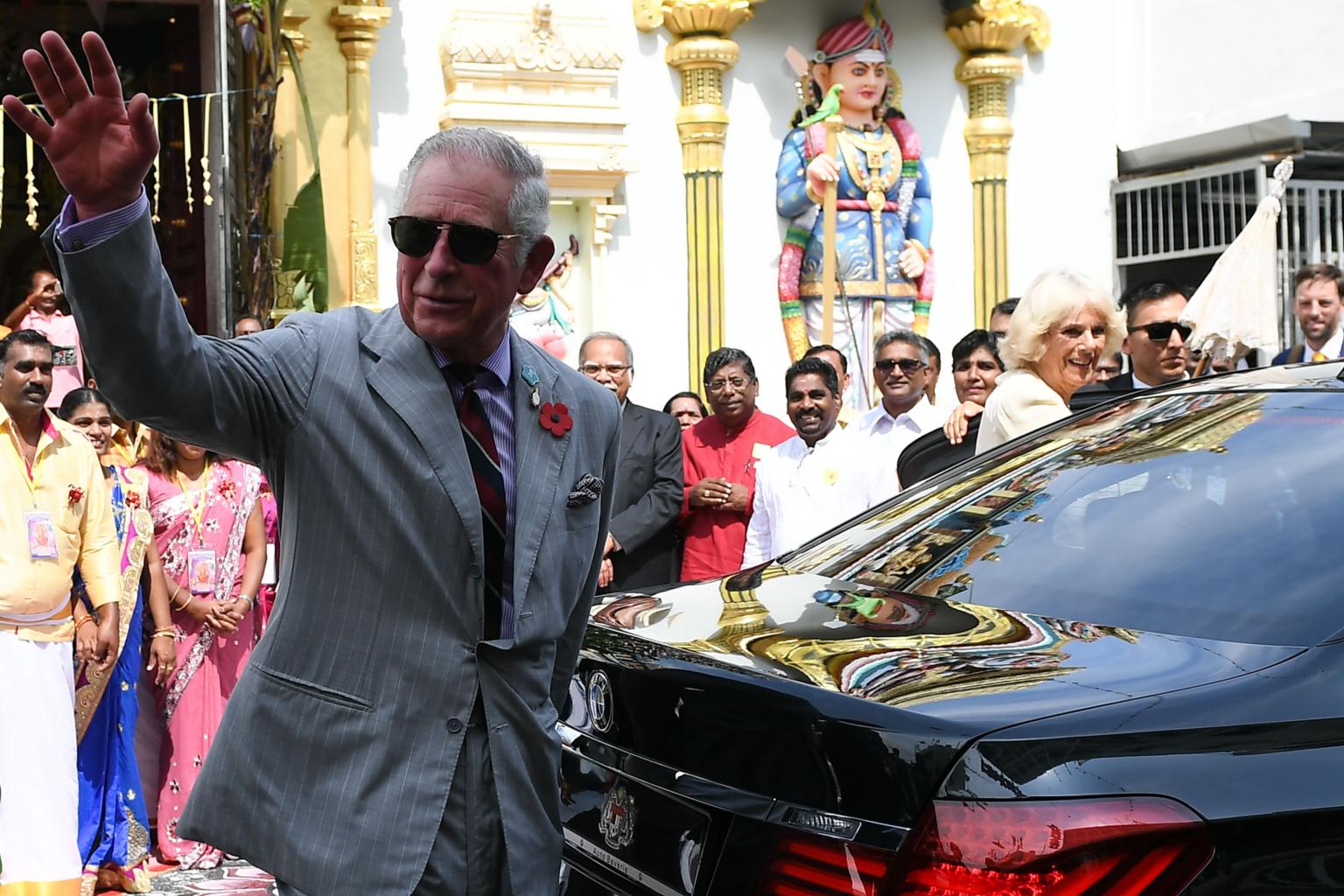 Britain's Prince Charles, Prince of Wales (left) waves to a gathered crowd as Camilla, Duchess of Cornwall (right) smiles after visiting the Sri Mahamariamman Temple in George Town, the capital of Malaysia's Penang state.