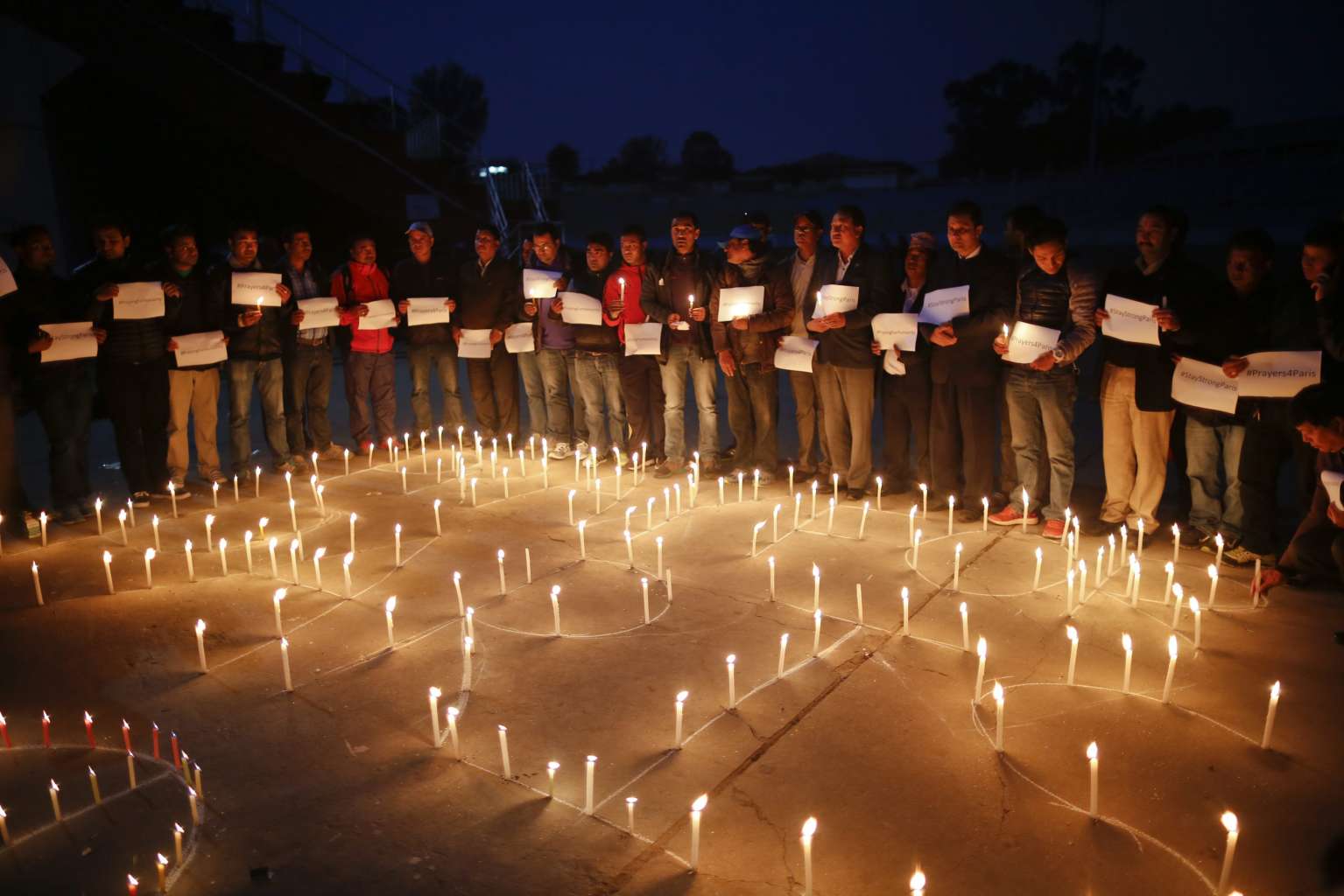 Nepalese journalists and sports personalities participate in a candlelight vigil for the victims of the Nov 13 Paris attacks in Nepal.