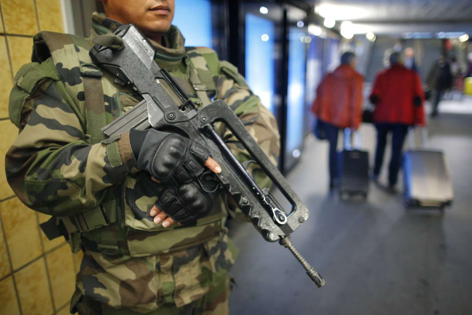A French soldier patrolling at a train station in Nantes, France on Nov 16, 2015, in the aftermath of the Paris attacks.