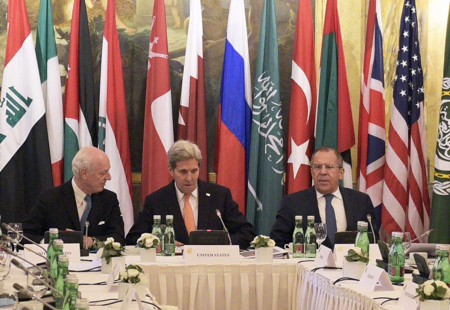 (From left) UN envoy for Syria Staffan de Mistura, US Secretary of State John Kerry and Russian Foreign Minister Sergei Lavrov at an international conference on Syria at the Hotel Imperial in Vienna on Nov 14, 2015.