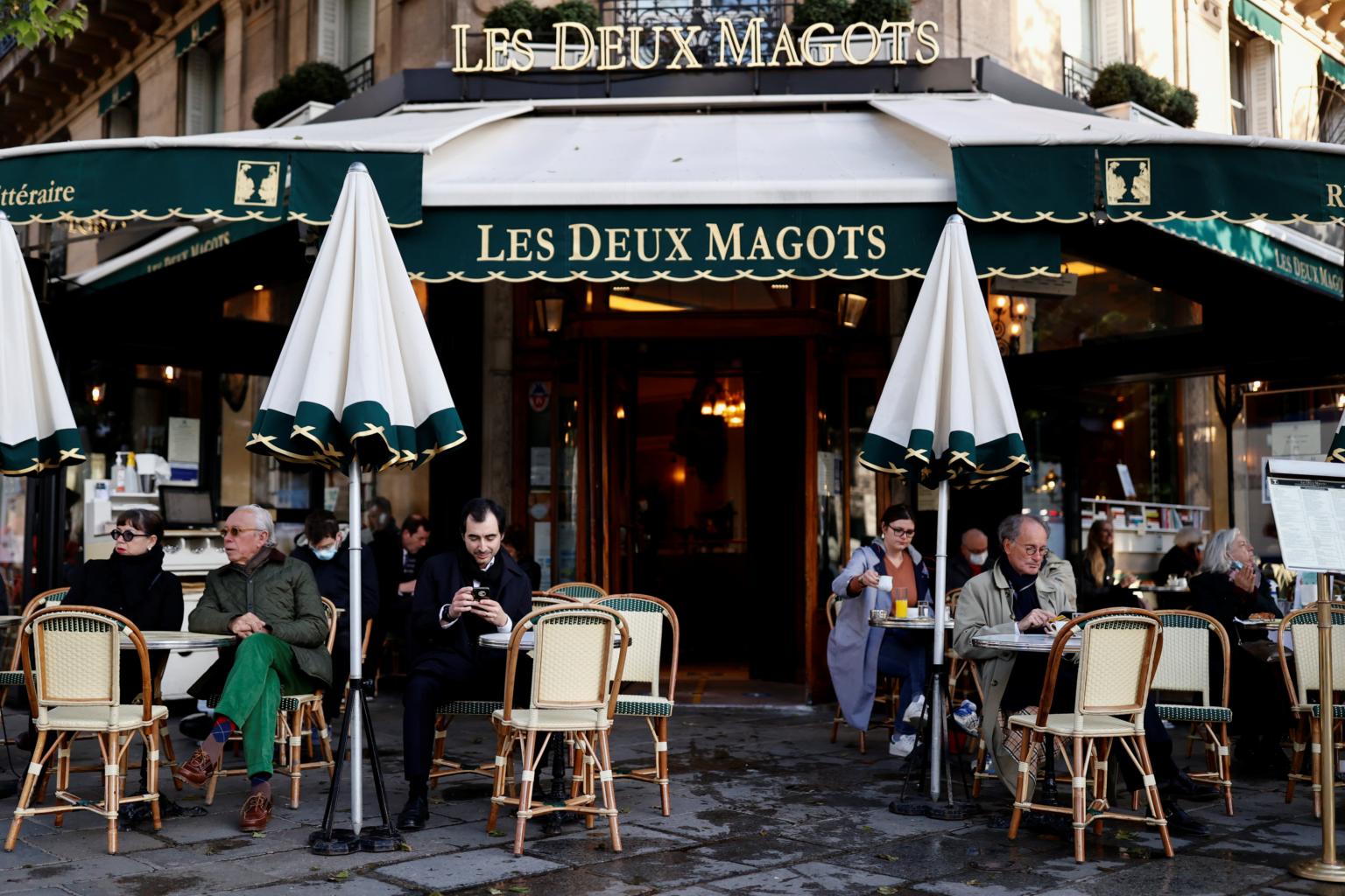 Customers sit on the terrace of the cafe and restaurant Les Deux Magots in Paris on May 19, 2021.