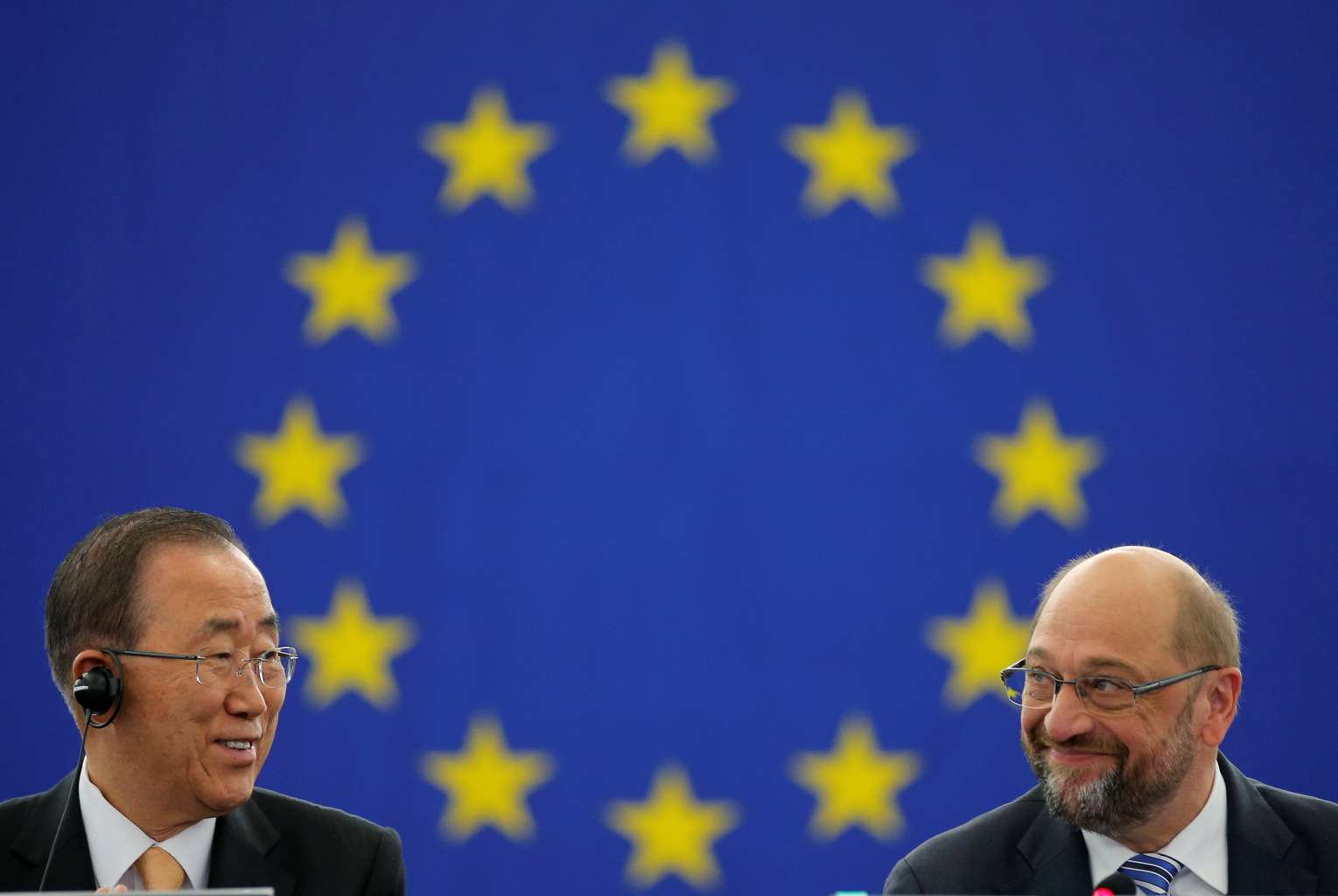 UN Secretary-General Ban Ki-moon (left) and European Parliament President Martin Schulz smile after the European Parliament vote in favour of the Paris UN COP 21 Climate Change agreement on Oct 4, 2016.