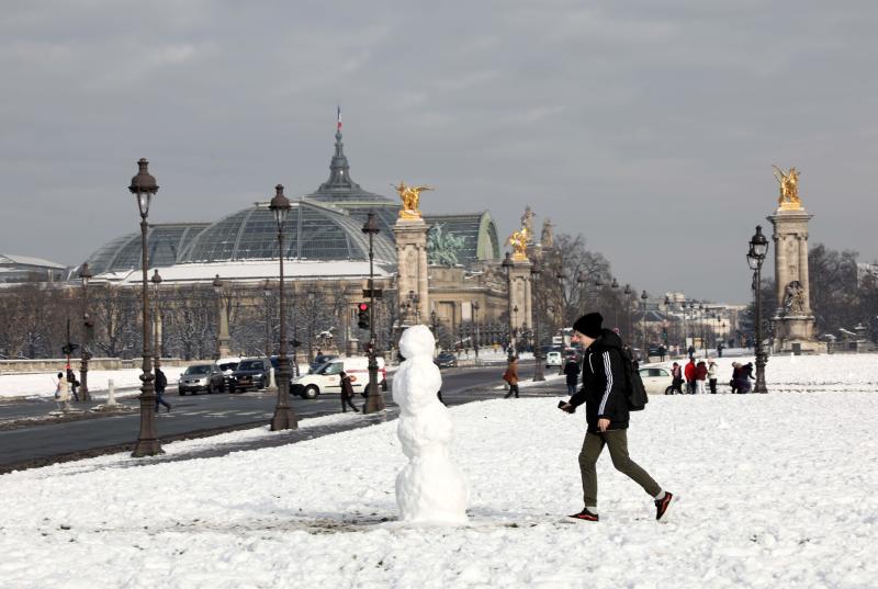 A pedestrian walks towards a snowman in front of Le Grand Palais in Paris on Feb 8, 2018.