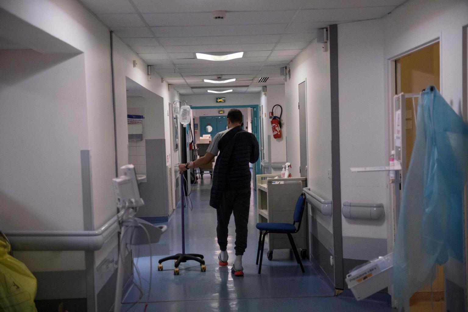 A patient walks along the corridor of the emergency unit of the Saint Camille hospital in Paris on Jan 21, 2022.