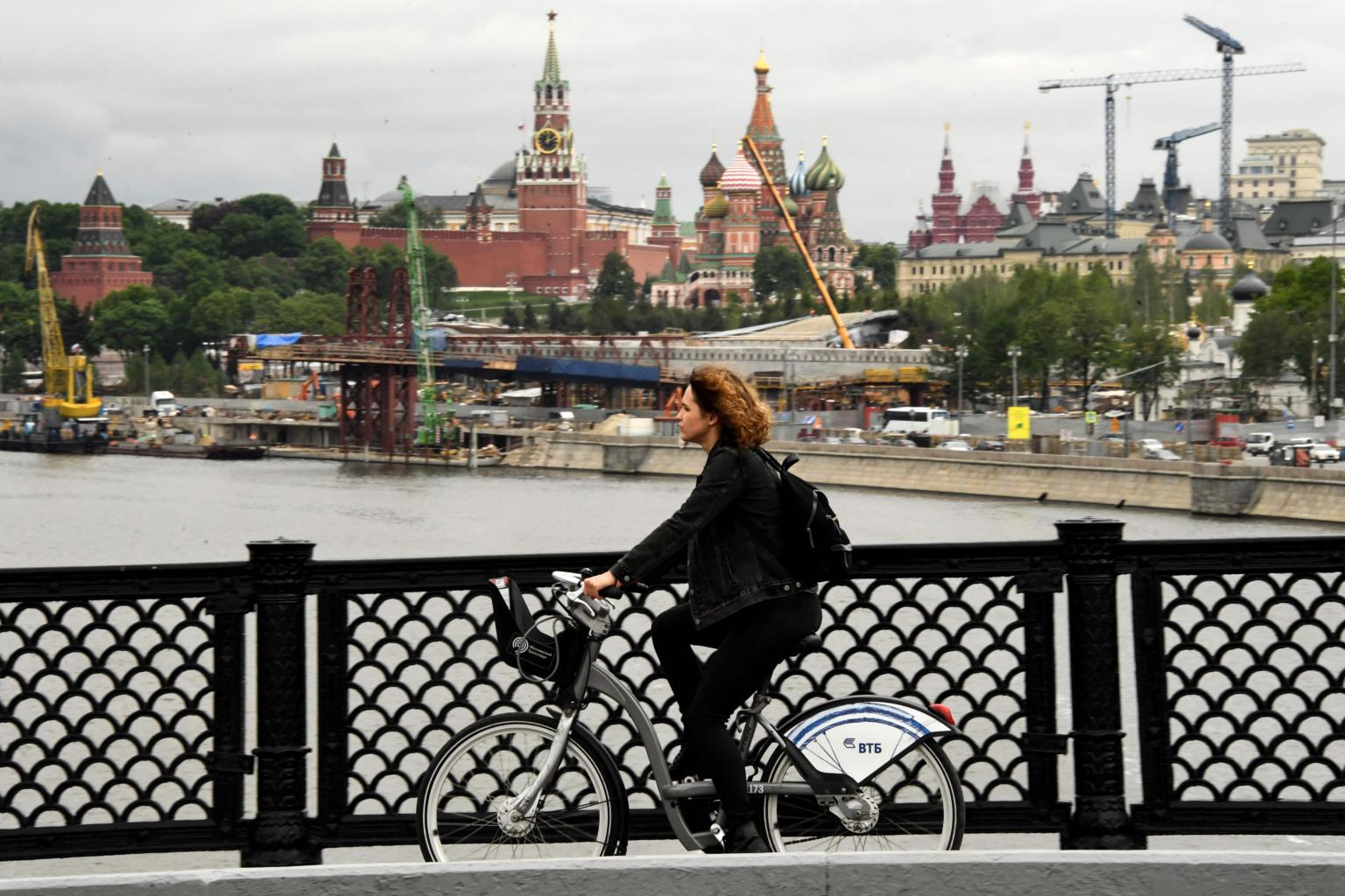 A woman riding a bicycle along a bridge over the Moskva river in central Russia.