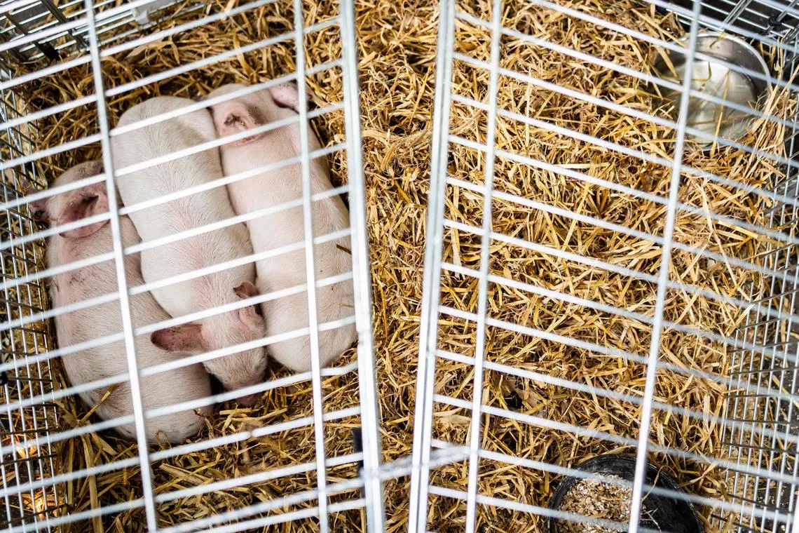 Three live piglets as part of the art show of artist Marco Evaristti in Copenhagen on Feb 28.