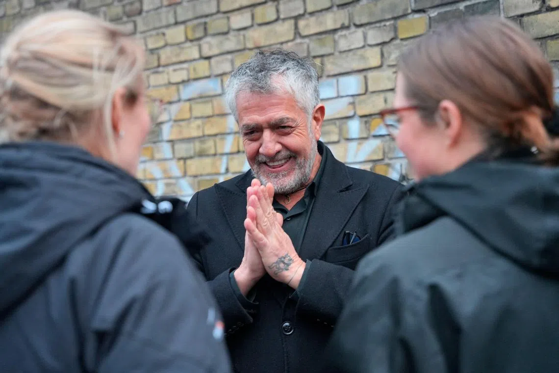 Chilean-born Danish artist Marco Evaristti speaking with police officers outside the venue for his exhibition And Now You Care? in Copenhagen on Feb 28.