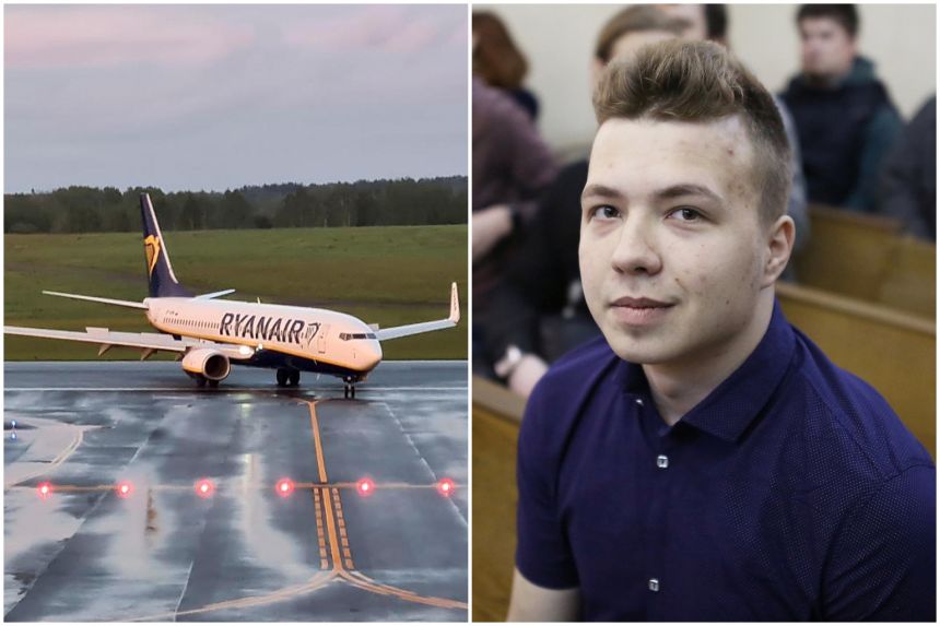 A Ryanair aircraft (left), which was carrying Belarusian opposition blogger Roman Protasevich (right), and was diverted to Belarus, lands at Vilnius Airport in Lithuania, on May 23, 2021.