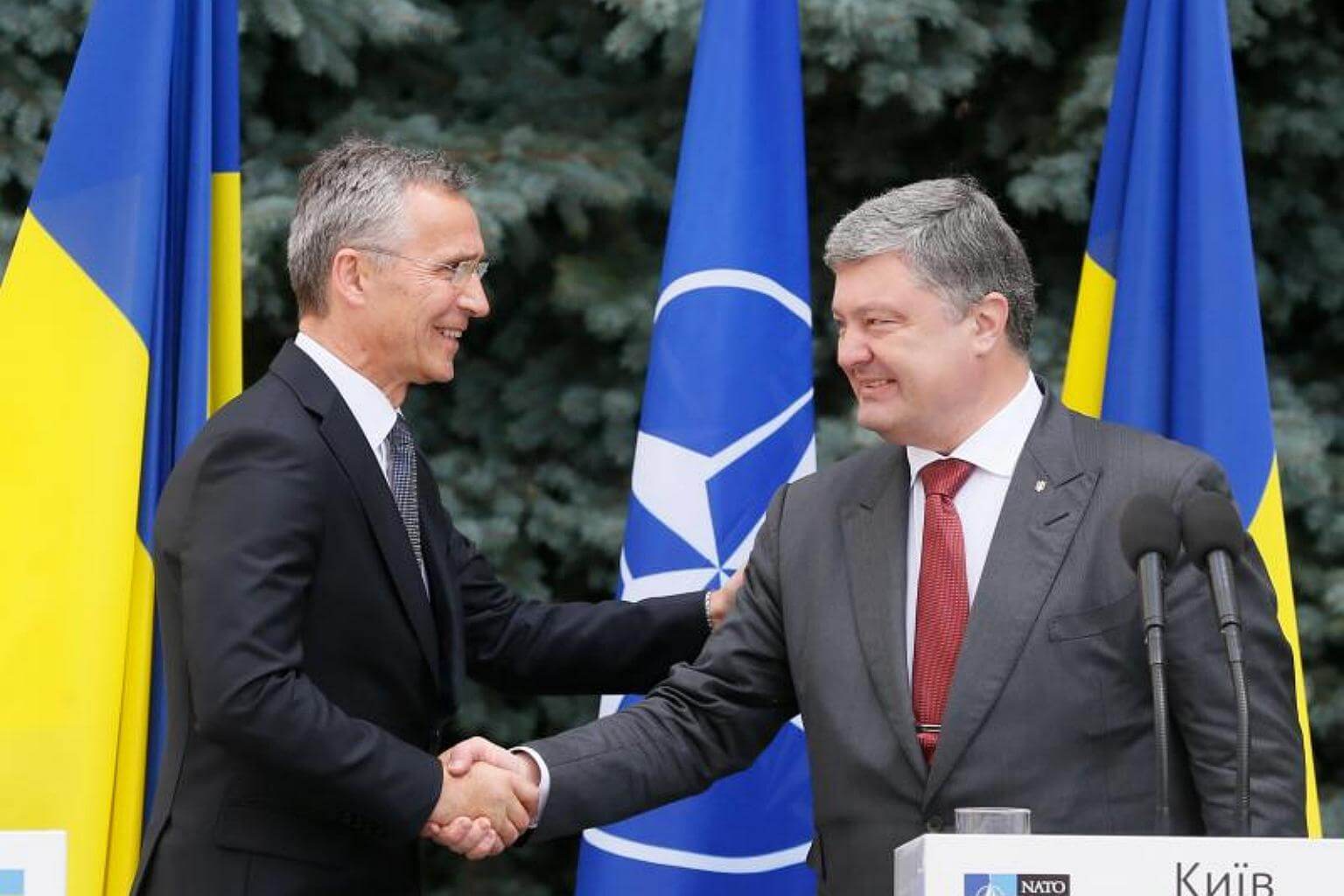 Ukrainian President Petro Poroshenko (right) shakes hands with Jens Stoltenberg (left), the Secretary General of NATO, during their press conference in Kiev, Ukraine, on July 10, 2017.