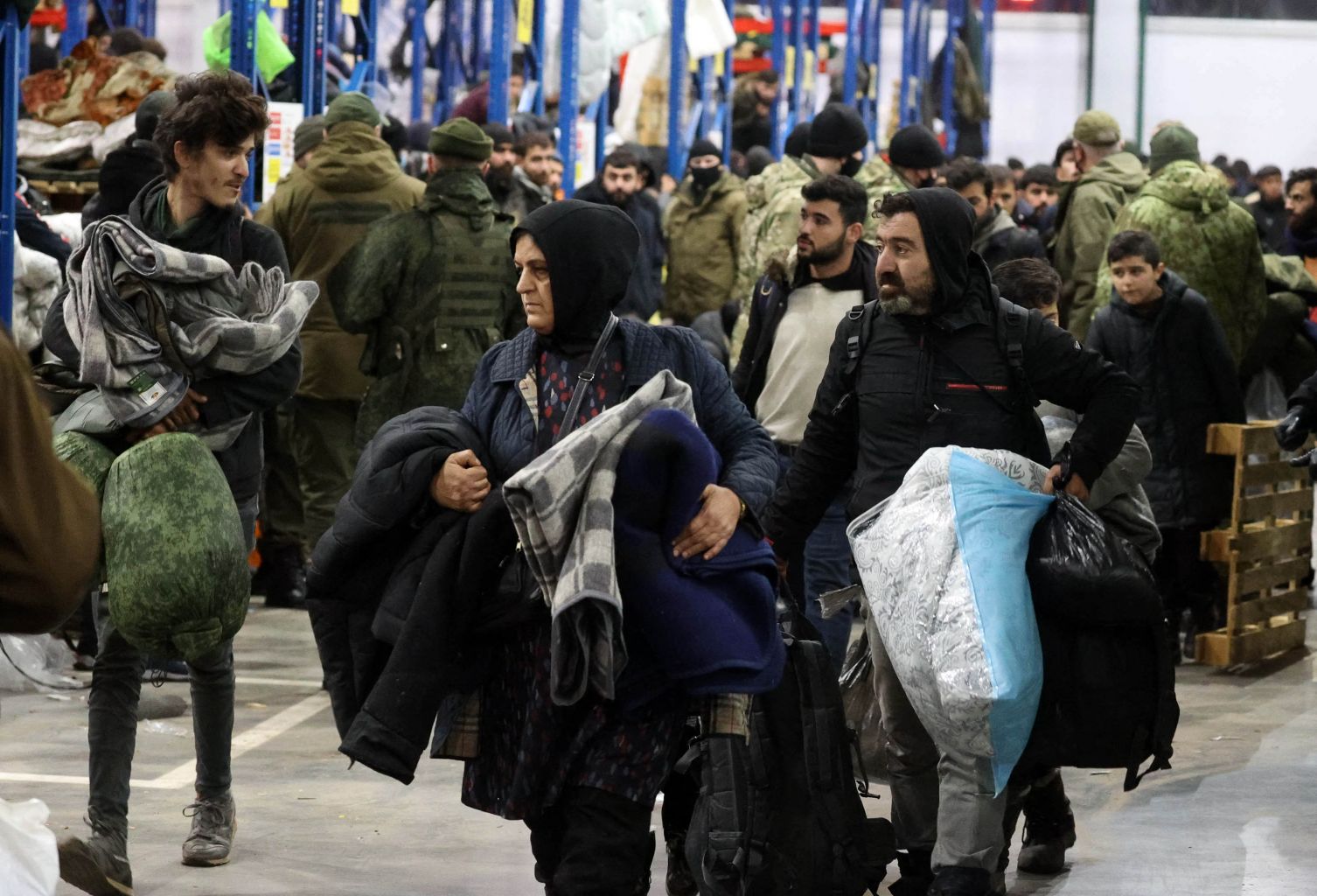 Migrants are pictured at a transport and logistics centre on the Belarusian-Polish border on Nov 20, 2021.