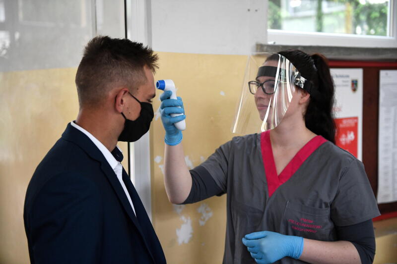A nursing student checks the body temperature of a secondary school student in Przemysl, Poland, on June 9, 2020.