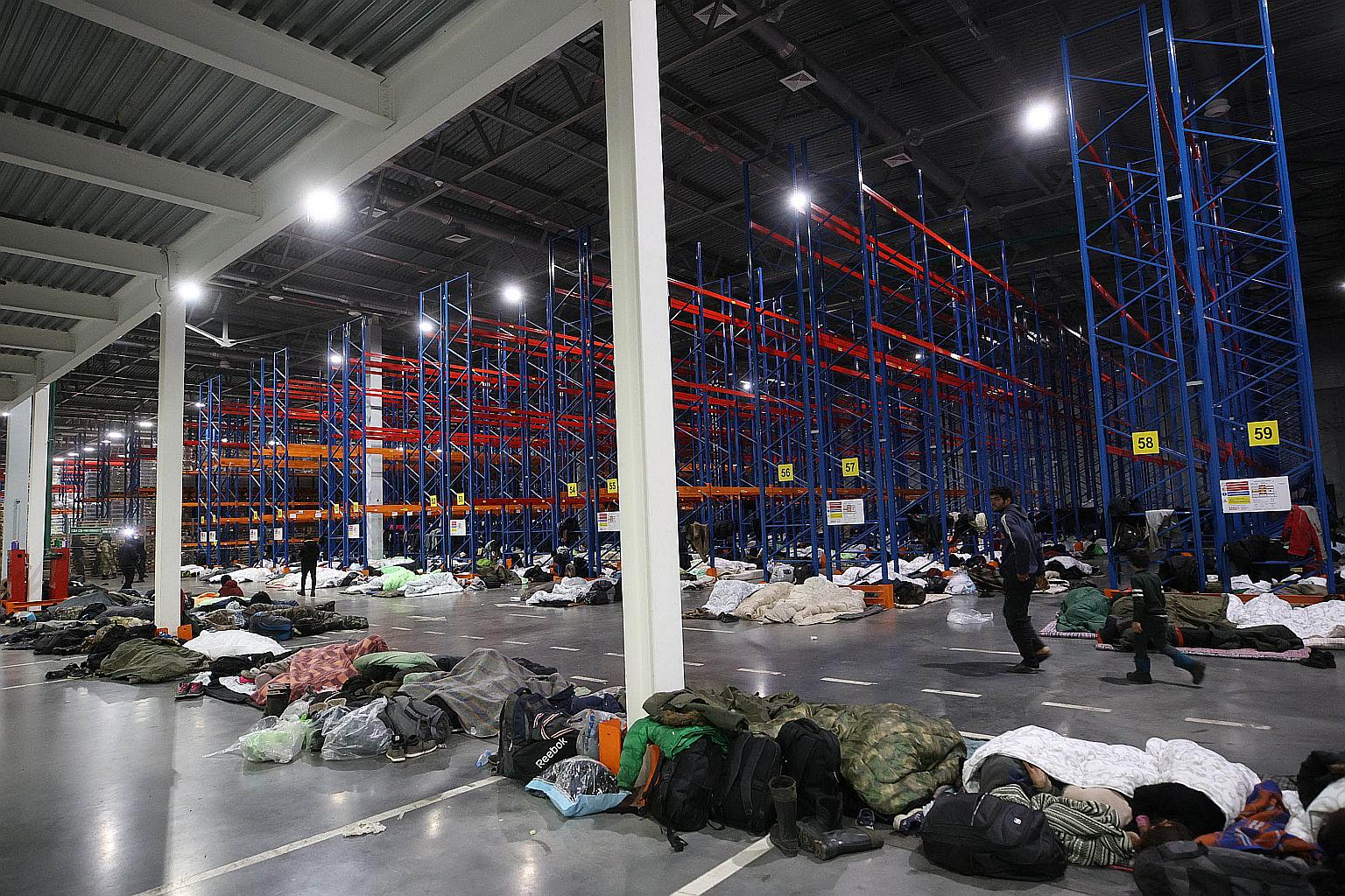 Migrants stay in the transport and logistics centre Bruzgi on the Belarusian-Polish border, on Nov 17, 2021.