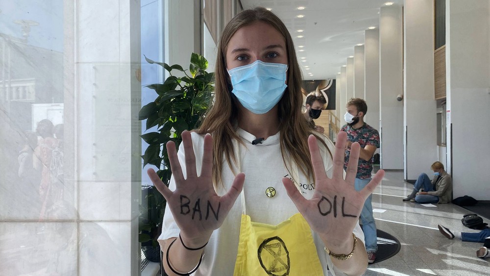 Around 17 campaigners, some with "Ban oil" written on their palms, occupied the ministry's reception.