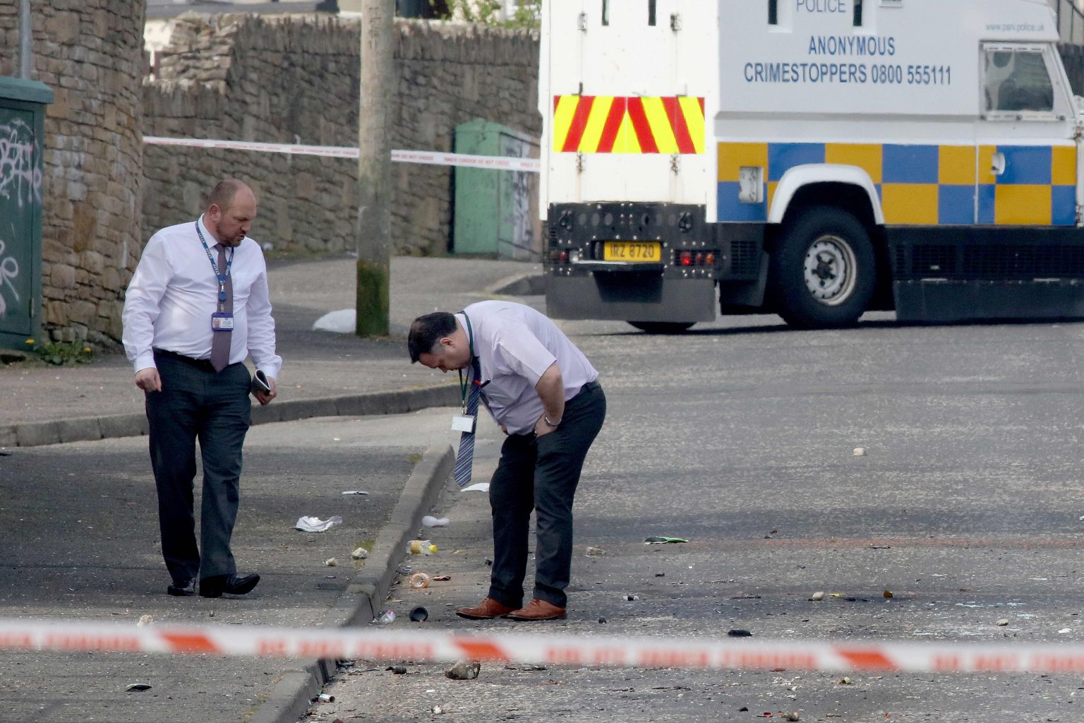 Police inspecting the scene where journalist Lyra McKee was fatally shot amid rioting in the Creggan area of Londonderry in Northern Ireland, on April 19, 2019.