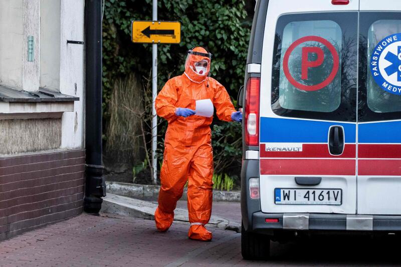 A paramedic, wearing a protective outfit, walks towards his vehicle at an infectious hospital in Warsaw, Poland, on March 14, 2020.