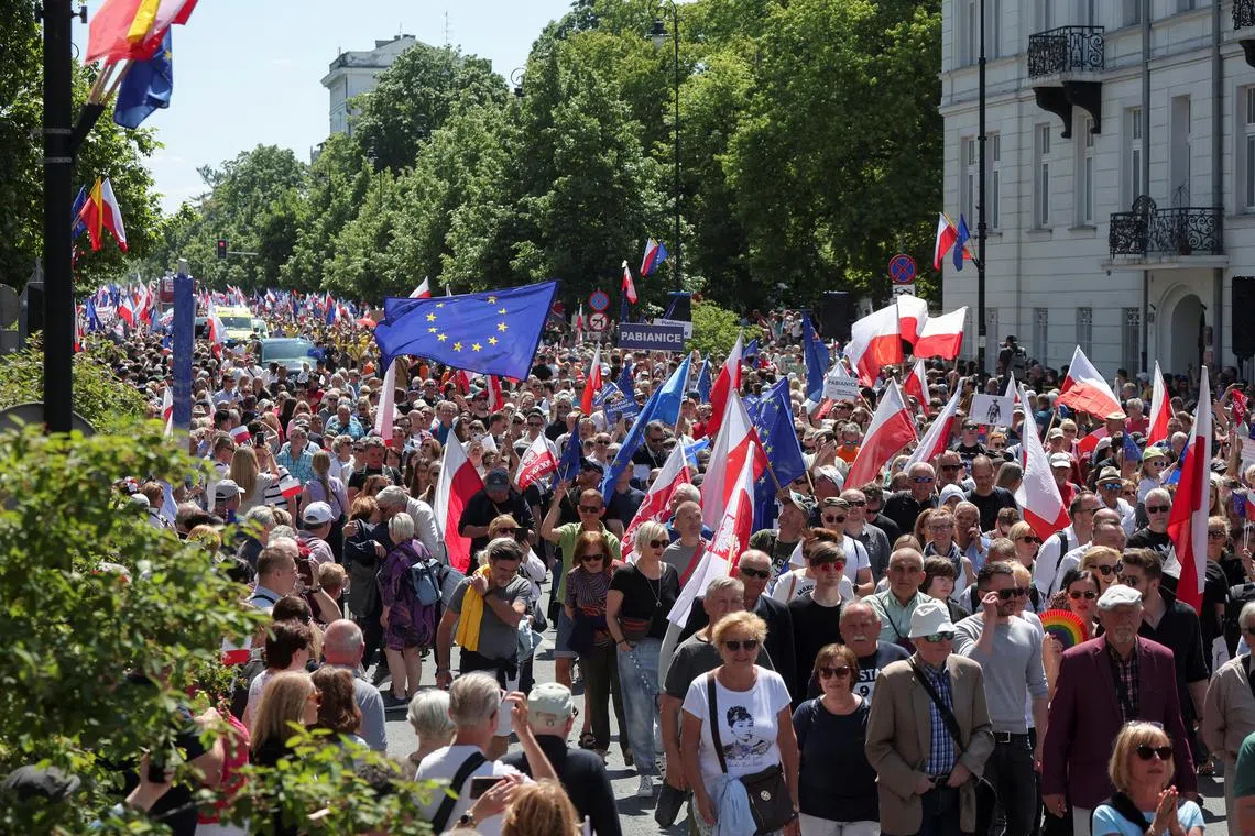 WARSAW - Hundreds of thousands of protesters gathered in Warsaw on Sunday – the 34th anniversary of Poland’s first post-war democratic election – for a march the liberal opposition has billed as a test of its ability to end nearly eight years of nationalist rule later this year.