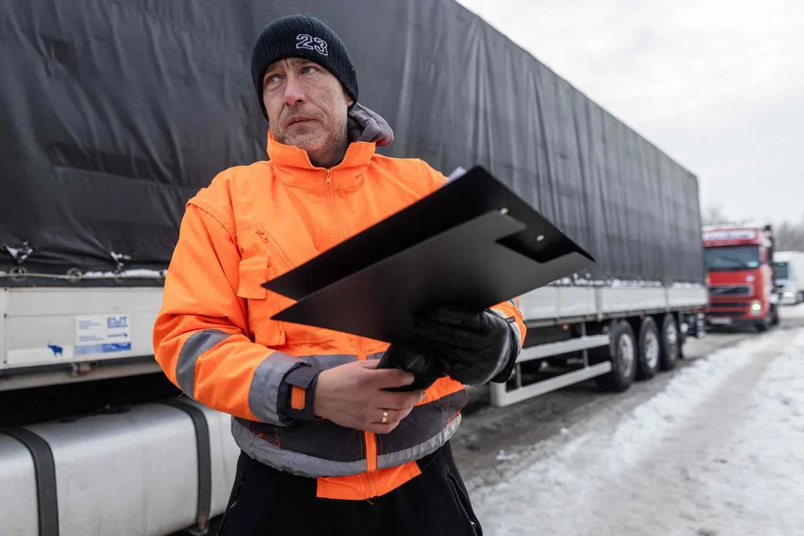Ukrainian truck driver Roman, 45, is seen with truck papers in a car park near the Polish-Ukrainian border crossing.