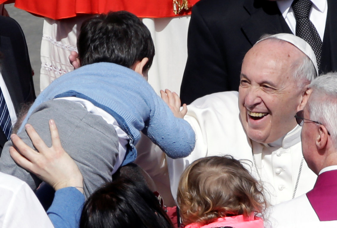 Pope Francis greeting a child at the end of the Easter Mass in St Peter's Square in the Vatican on April 1, 2018.