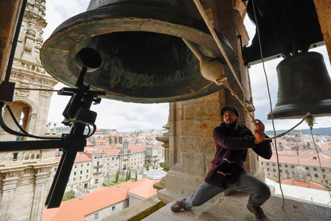 A bell-ringer ringing the bells of Santiago de Compostela Cathedral in Galicia, Spain, following Pope Francis’ death.