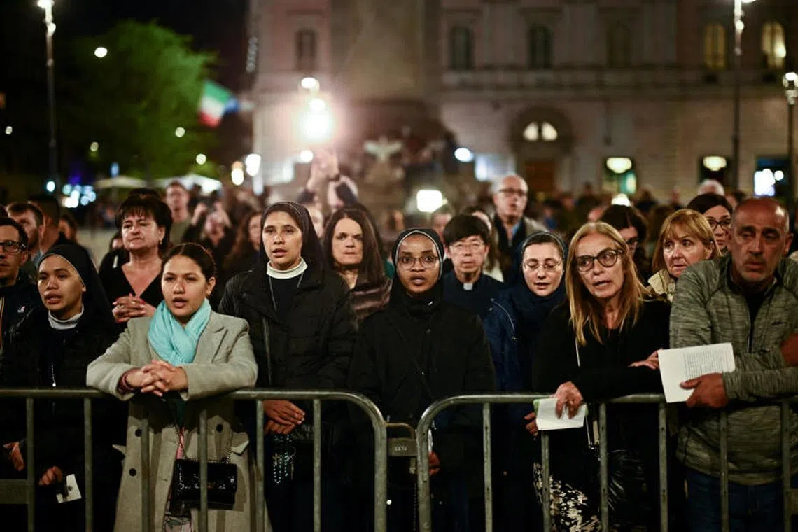 Catholics gathering during a rosary for Pope Francis at Basilica of Santa Maria Maggiore, following the death of the pontiff, in Rome, Italy.