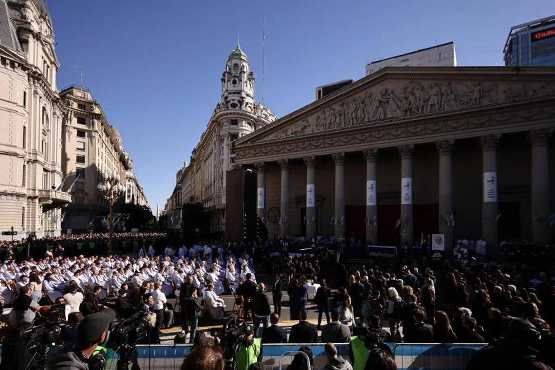 People and members of the clergy attending a mass to honour Pope Francis in front of the Metropolitan Cathedral in Buenos Aires, Argentina.