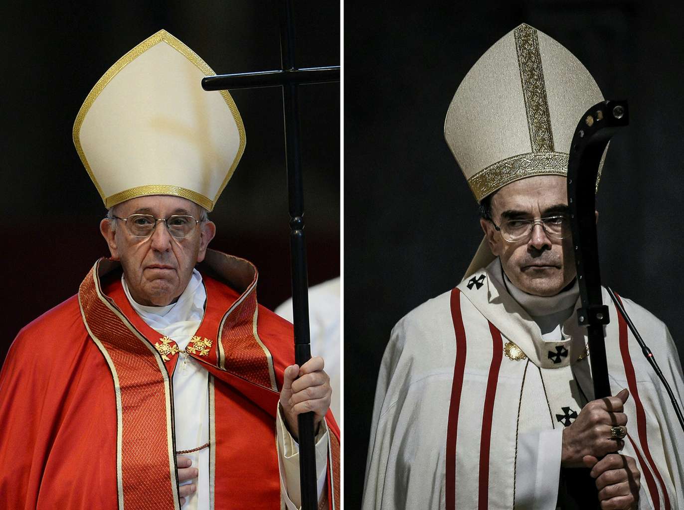 Pope Francis (left) attending the funeral of Cardinal Giovanni Coppa at St. Peter's Basilica in Vatican, on May 18, 2016, and Cardinal Philippe Barbarin leading a mass in Saint-Jean cathedral in Lyon, on April 3, 2016.
