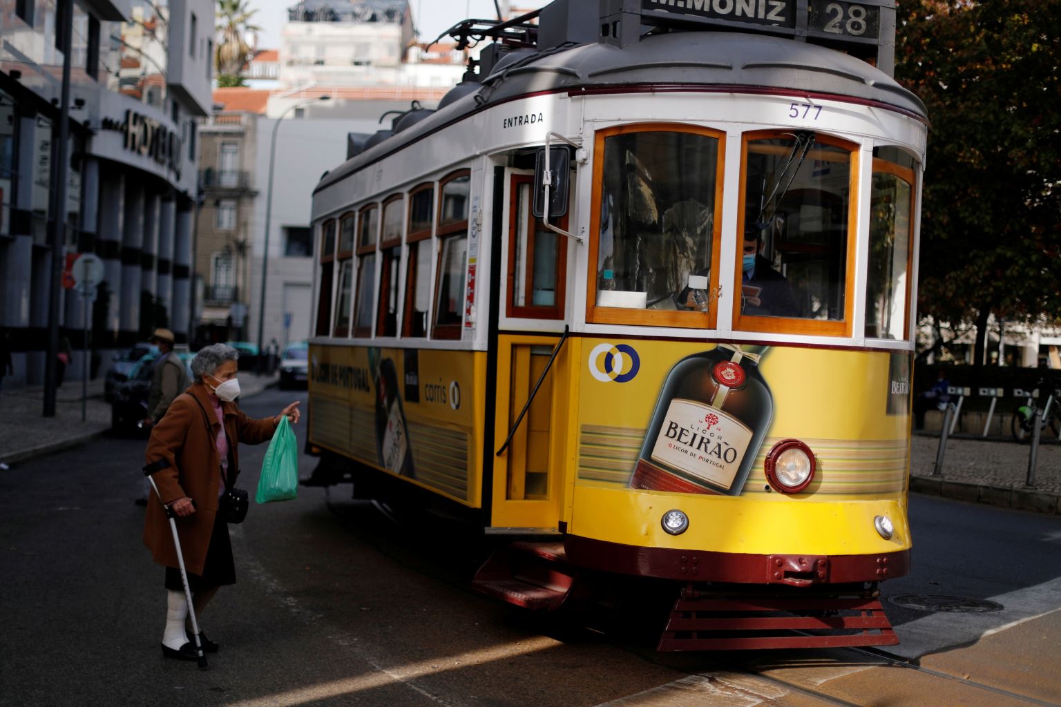 A woman speaks with the driver of a tram in downtown Lisbon, Oct 31, 2020.