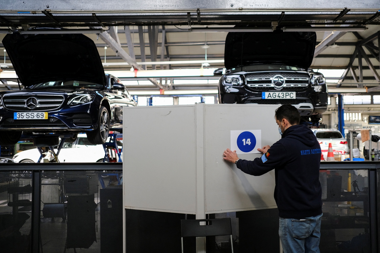 A volunteer prepares a polling station at an auto repair shop for the snap elections, in Lisbon on Jan 29, 2022.