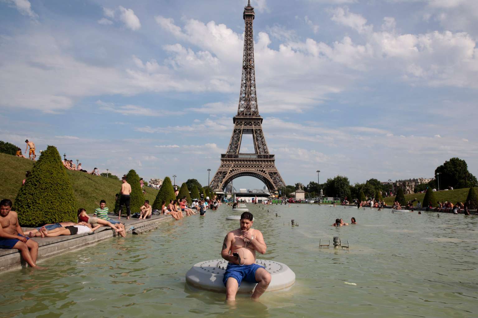 A man speaks on the phone as he sits in Fountain of Warsaw at the Gardens of the Trocadero with the Eiffel Tower on the back ground during warm temperatures in Paris on May 27, 2017.