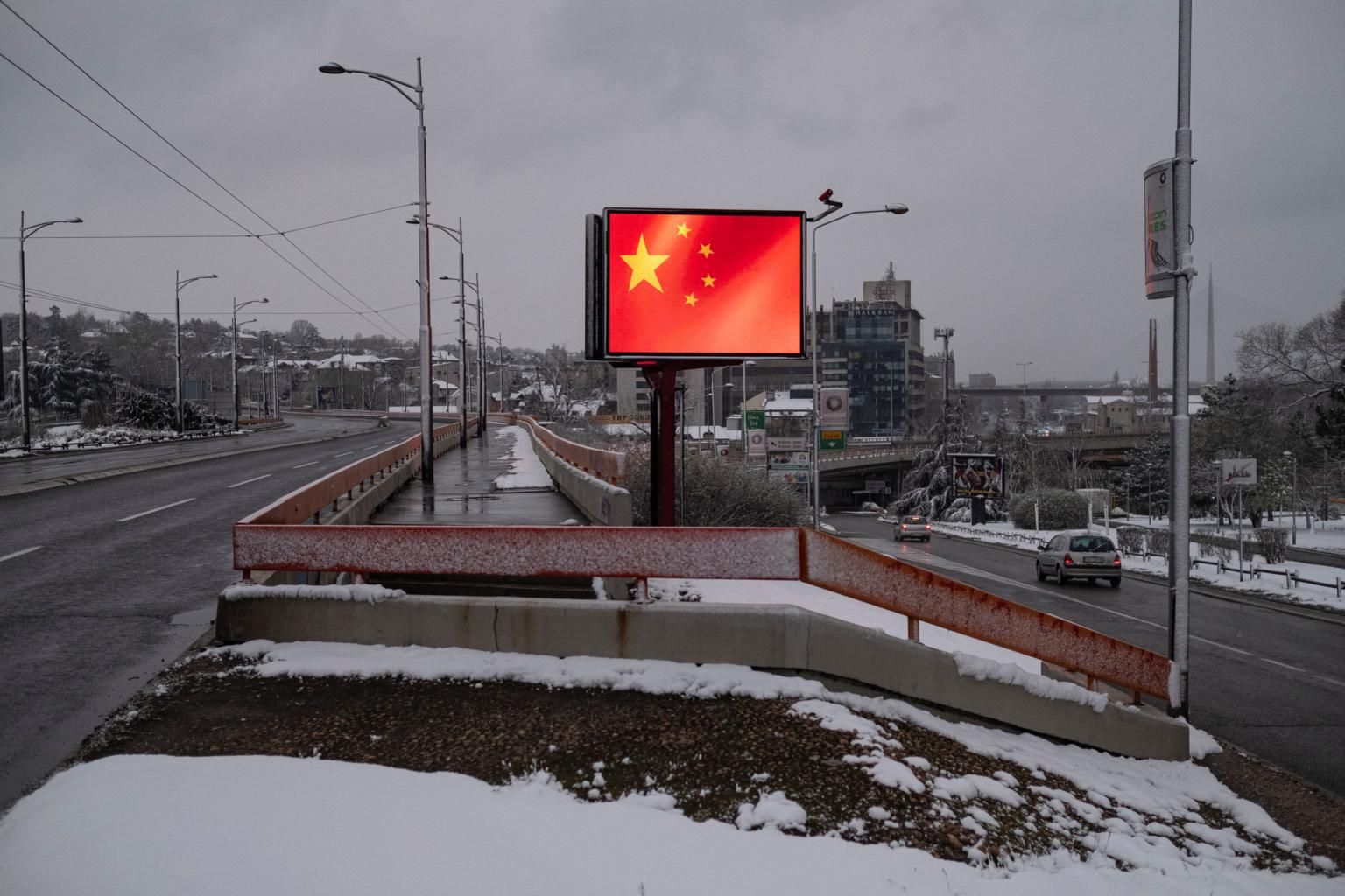 In a photo from March 24, 2020, a Chinese flag is displayed on a billboard in gratitude to China in Belgrade, Serbia.