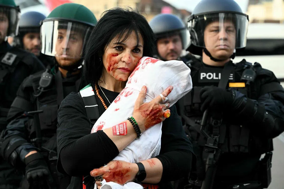 One woman, her face smeared with red, cradled a seemingly bloody bundle representing the children dying in the war raging in the Gaza Strip as police in riot gear looked on.