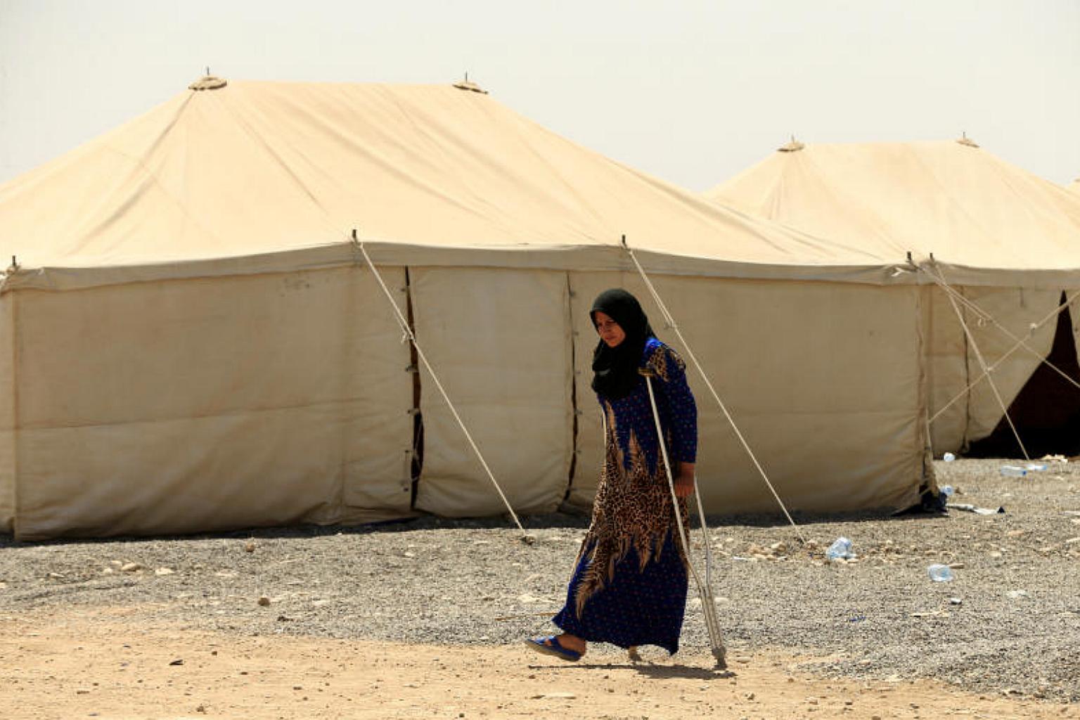 A woman on crutches, a relative of men accused of being Islamic State militants, is seen at a camp in Bartella, east of Mosul, on July 15, 2017.
