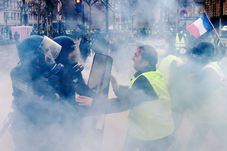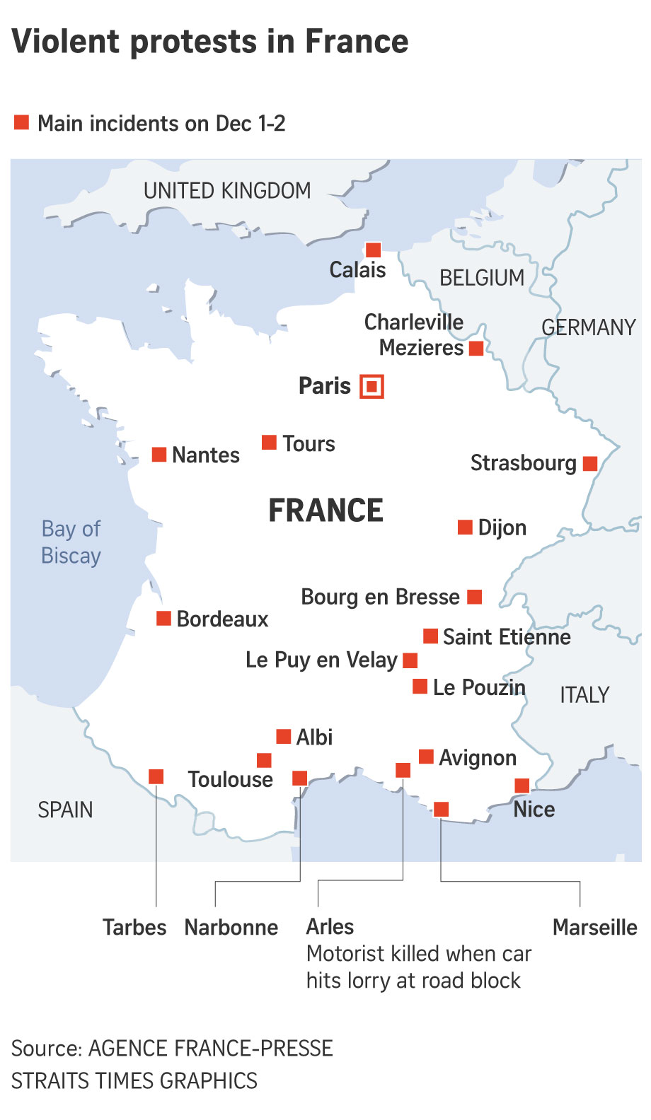 PARIS (AFP, REUTERS) - French riot police fought running battles with "yellow vest" protesters in the streets of Paris, in a third weekend of nationwide unrest against high living costs that pose one of the gravest challenges to Emmanuel Macron's presidency.