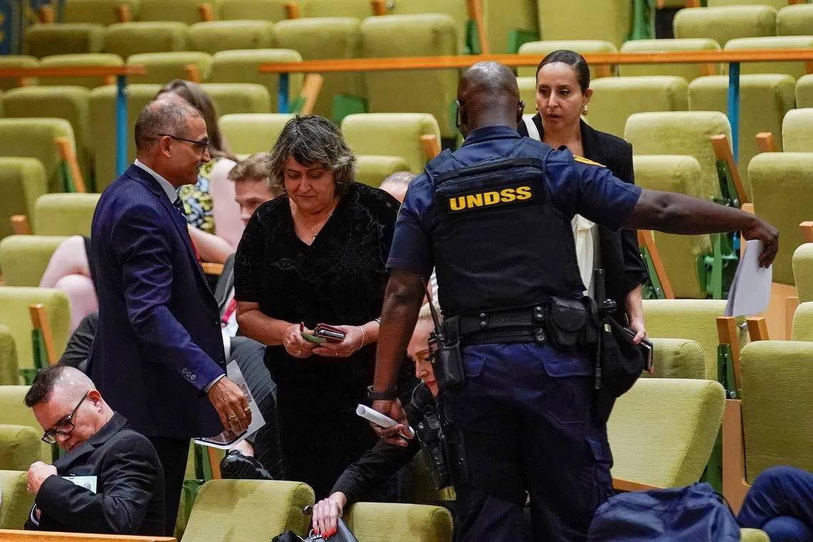UNITED NATIONS - A meeting of the United Nations Security Council on the Middle East was briefly interrupted on July 17 when two protesters stood with signs and yelled for the release of Israeli hostages held by Palestinian militants Hamas in the Gaza Strip.