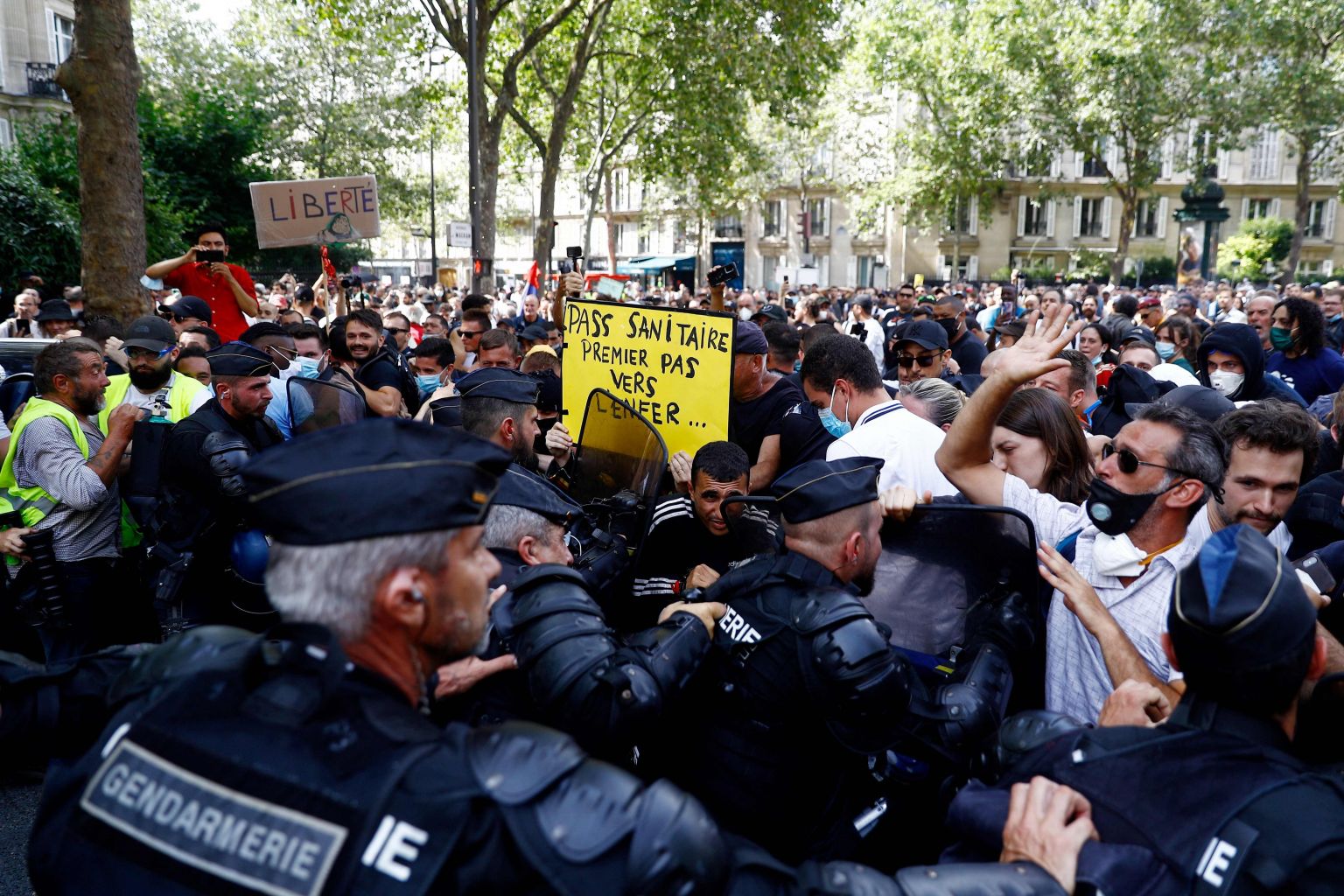 French riot police face protesters, some wearing yellow vests, during an anti-Covid measures demonstration in Paris on July 24, 2021.