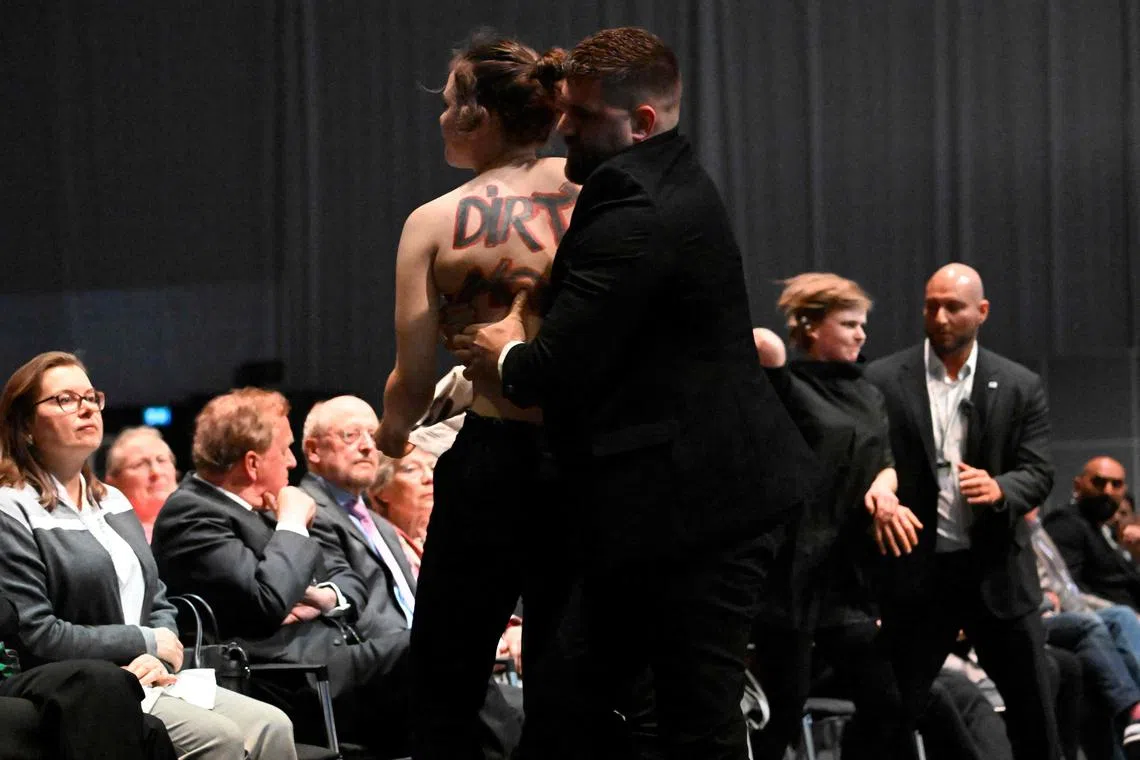 A topless woman also interrupted the speech given by Volkswagen chief executive Oliver Blume to criticise the group’s operations in the Chinese region of Xinjiang.