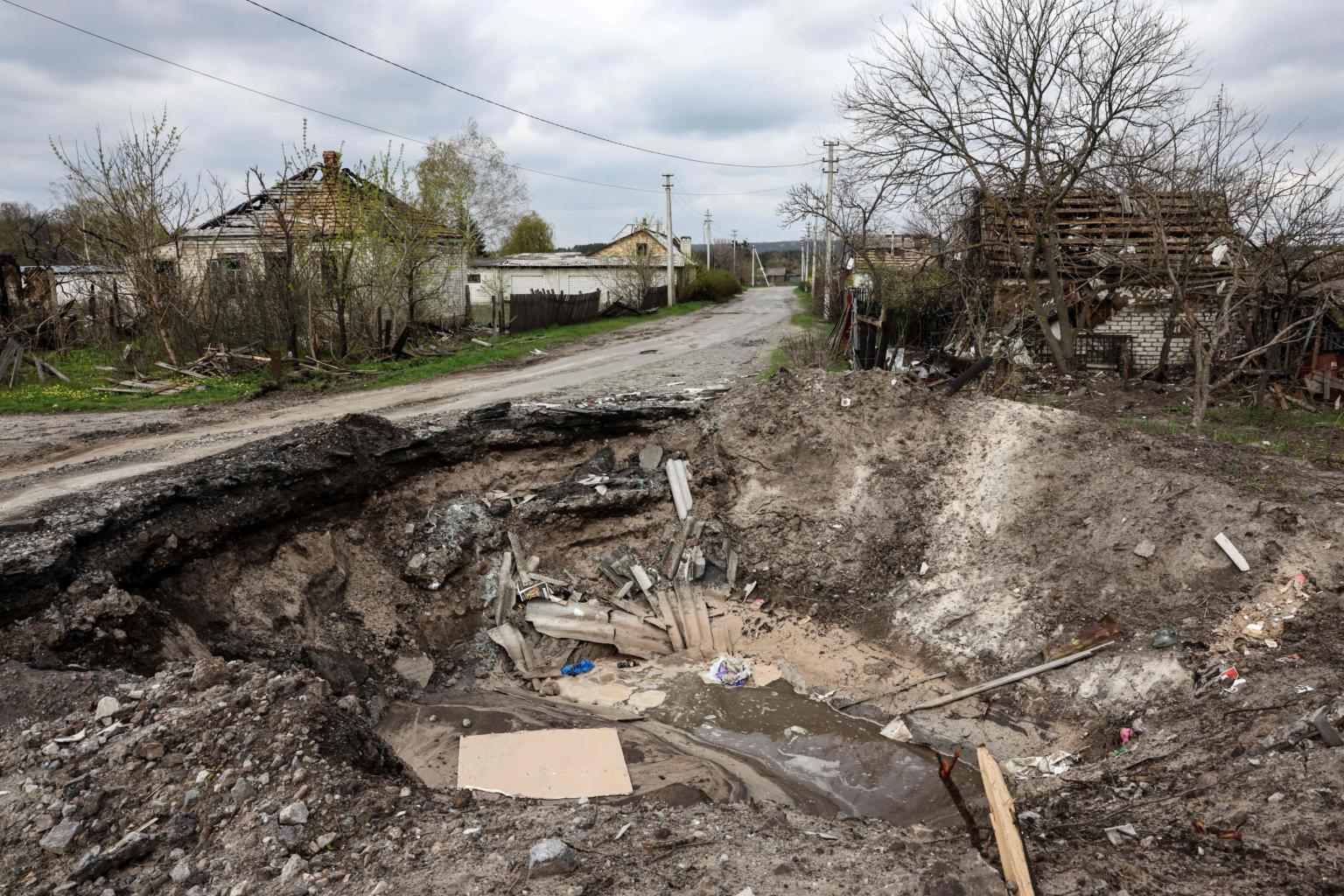 A crater and a destroyed home are pictured in the village of Yatskivka, eastern Ukraine on April 16, 2022.