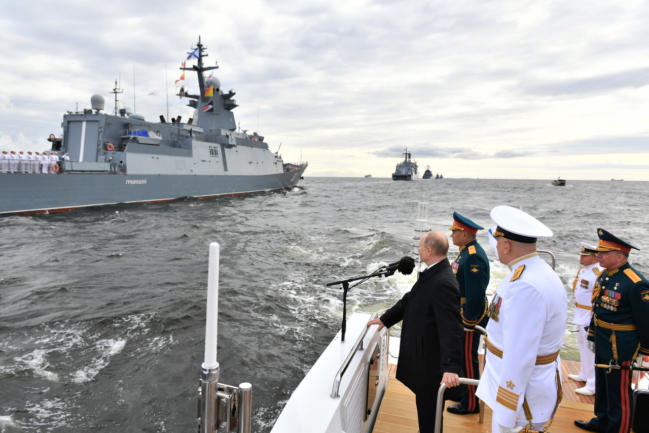 President Vladimir Putin (left) attends the Russia Navy Day parade in St Petersburg, on July 25, 2021.