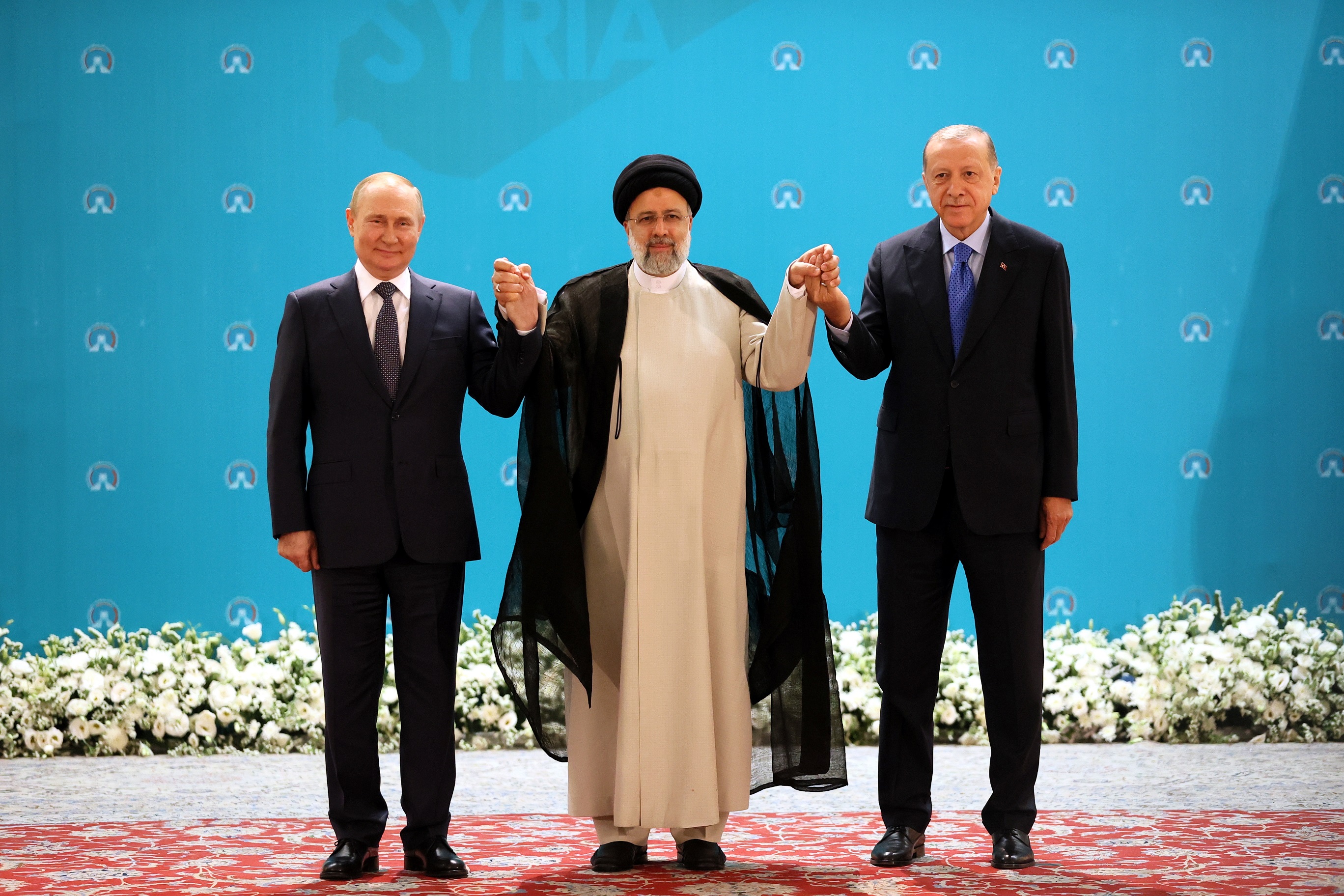 (From left) Russian President Vladimir Putin, Iranian President Ebrahim Raisi and Turkish President Recep Tayyip Erdogan pose during a trilateral summit in Teheran.