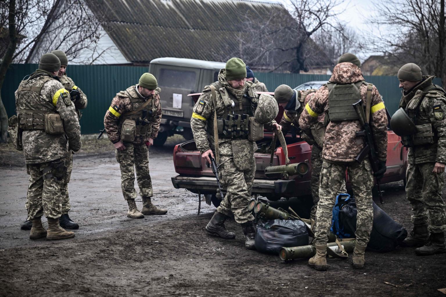 Ukrainian soldiers unload weapons from an old car, northeast of Kyiv, on March 3, 2022.