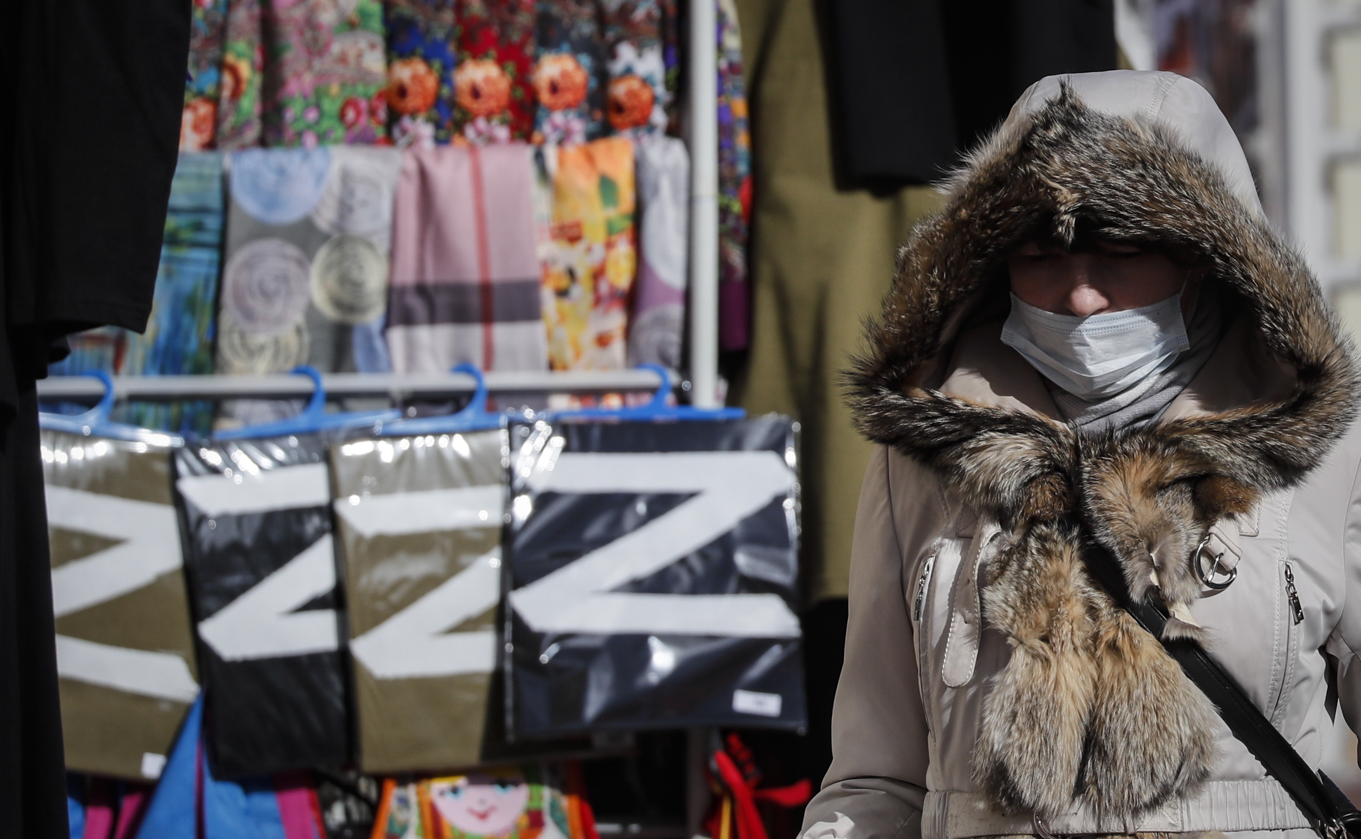 A woman in Moscow walks past T-shirts featuring the "Z" logo, which has become a symbol of support for Russia's "special military operation" in Ukraine.
